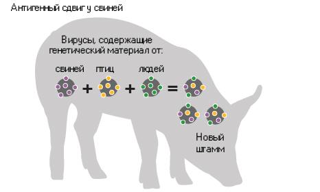 Название "свиной грипп" появилось, как полагают, вследствие того, что свиньи были "плавильным котлом", в котором перемешались несколько штаммов вируса гриппа, содержавших генетический материал свиней, птиц и человека (см. рисунок).