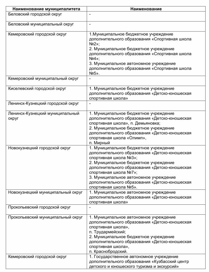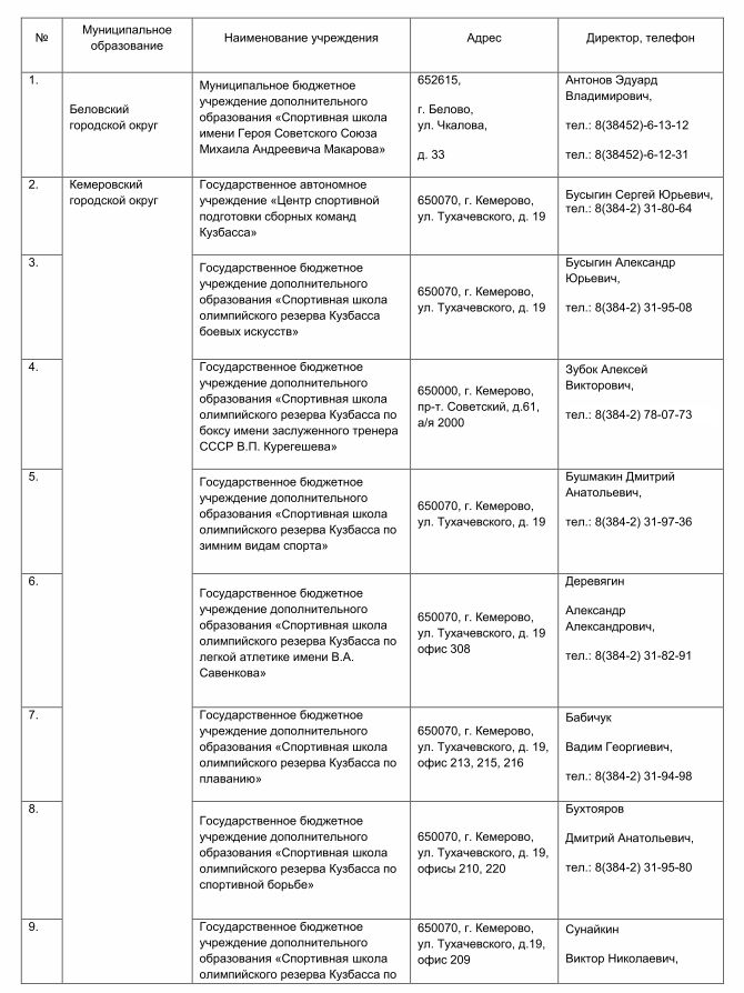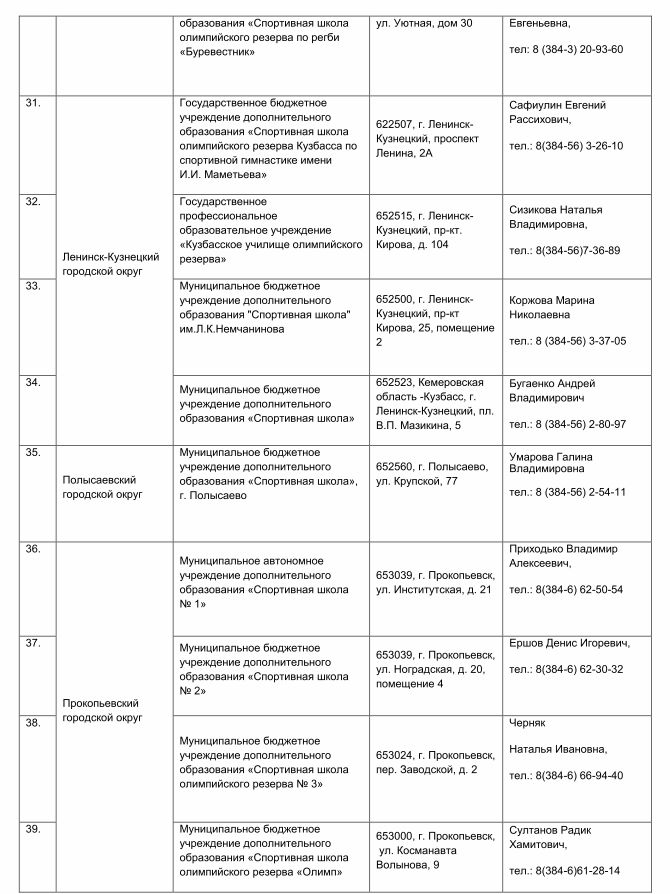 Список государственных учреждений, подведомственных Минспорту Кузбасса, муниципальных спортивных школ, спортивных школ олимпийского резерва, выполняющих государственное/муниципальное задание *