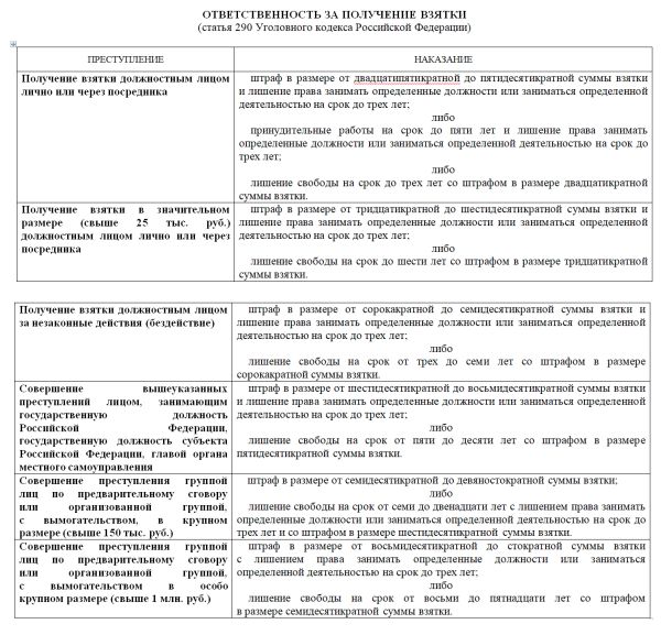 Получение взятки – получение должностным лицом, иностранным должностным лицом либо должностным лицом публичной международной организации лично или через посредника взятки в виде денег, ценных бумаг, иного имущества либо в виде незаконных оказания ему услуг имущественного характера, предоставления иных имущественных прав за совершение действий (бездействие) в пользу взяткодателя или представляемых им лиц, если такие действия (бездействие) входят в служебные полномочия должностного лица либо если оно в силу должностного положения может способствовать таким действиям (бездействию), а равно за общее покровительство или попустительство по службе (статья 290 УК РФ).