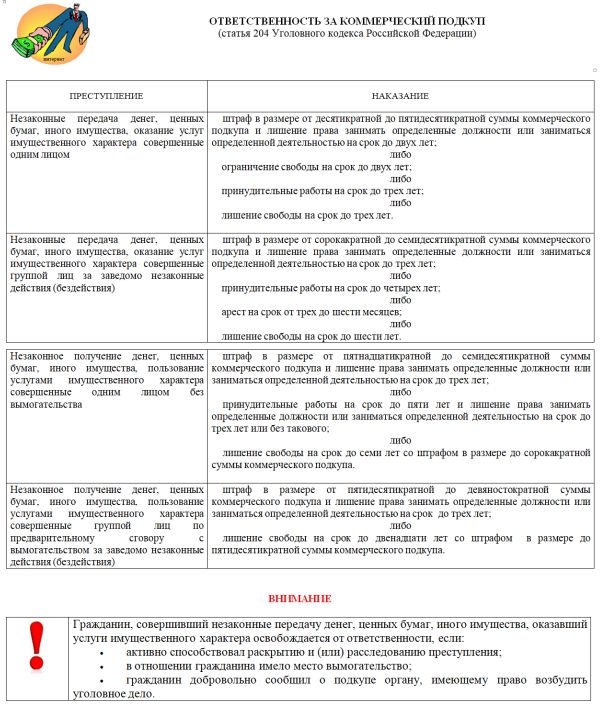 Коммерческий подкуп – незаконные передача лицу, выполняющему управленческие функции в коммерческой или иной организации, денег, ценных бумаг, иного имущества, оказание ему услуг имущественного характера, предоставление иных имущественных прав за совершение действий (бездействие) в интересах дающего в связи с занимаемым этим лицом служебным положением (статья 204 УК РФ).