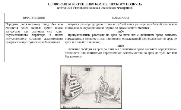 Провокация взятки либо коммерческого подкупа попытка - передачи должностному лицу либо лицу, выполняющему управленческие функции в коммерческих или иных организациях, без его согласия денег, ценных бумаг, иного имущества или оказания ему услуг имущественного характера в целях искусственного создания доказательств совершения преступления либо шантажа (статья 304 УК РФ).