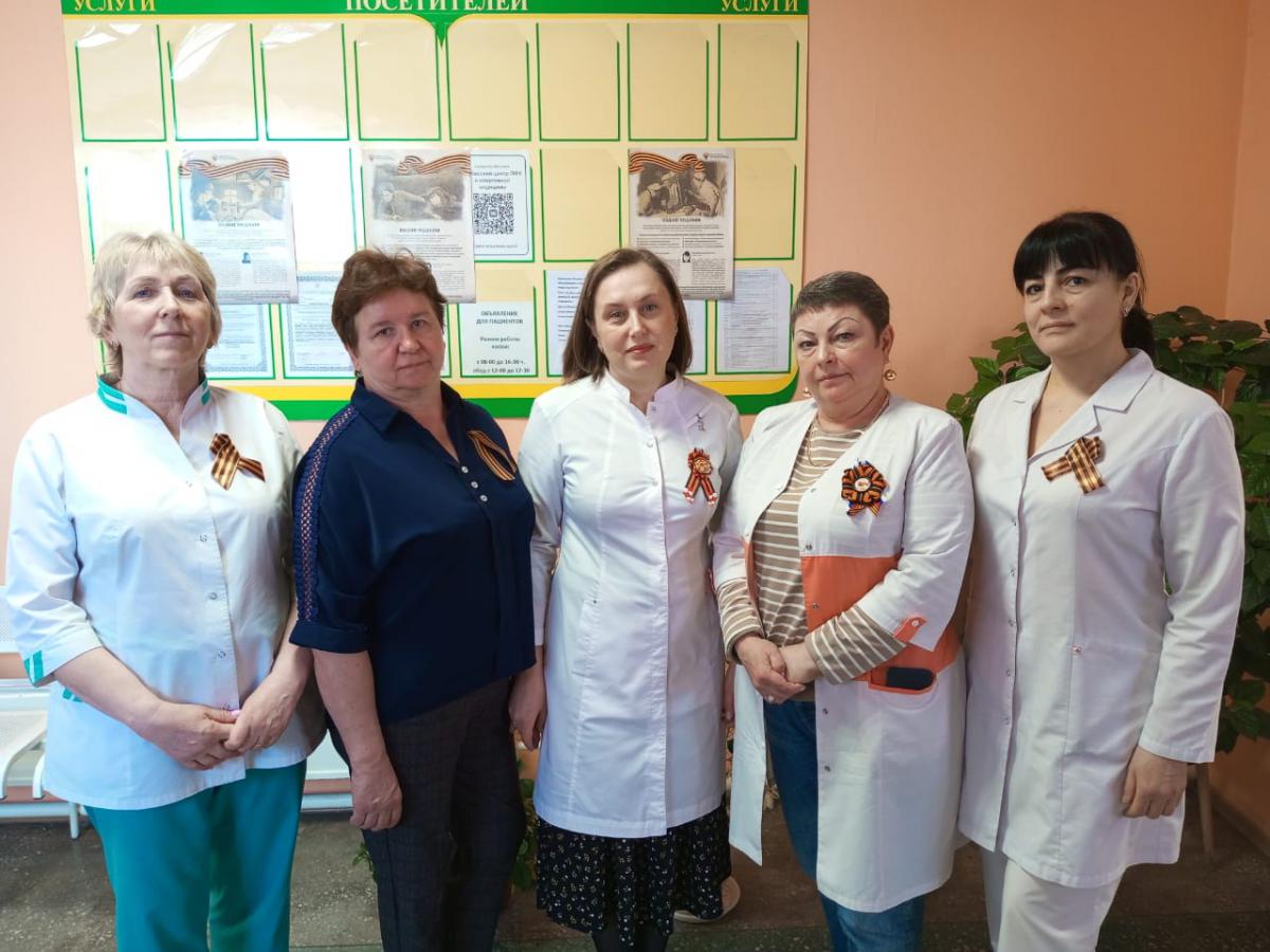В знак гордости и уважения к подвигам защитников Отечества окна и помещения организации украшены символами Победы, а на медицинских халатах сотрудников прикреплены черно-оранжевые ленты.